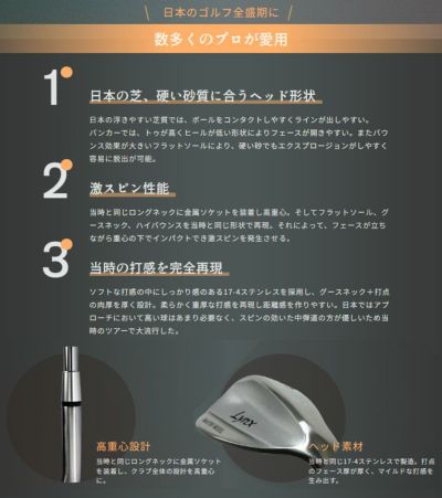当時と同じロングネックに金属ソケットを装着し高重心。そしてフラットソール、グースネック、ハイバウンスを当時と同じ形状で再現。それによって、フェースが立ちながら重心の下でインパクトでき激スピンを発生させる。