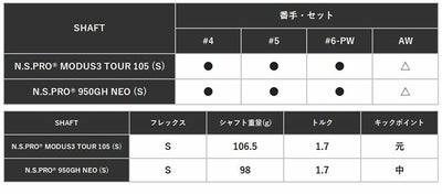※N.S.PROR MODUS3 TOUR 105 (S) のスペック数値 (シャフト重量、トルク、キックポイント)は日本シャフト株式会社の公表値です