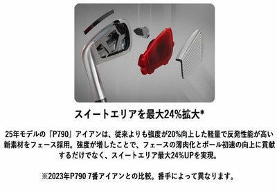 25年モデルの『P790』アイアンは、従来よりも強度が20%向上した軽量で反発性能が高い新素材をフェース採用。強度が増したことで、フェースの薄肉化とボール初速の向上に貢献するだけでなく、スイートエリア最大24%UPを実現。