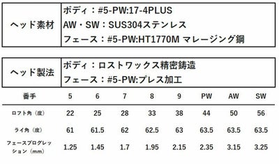 ヘッド製法ボディ:ロストワックス精密鋳造、フェース:#5-PW:プレス加工