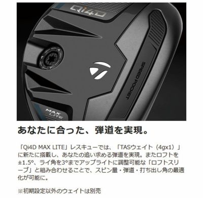 「Qi4D MAX LITE」レスキューでは、「TASウェイト(4gx1)」に新たに搭載し、あなたの追い求める弾道を実現。またロフトを±1.5°、ライ角を3°までアップライトに調整可能な「ロフトスリーブ」と組み合わせることで、スピン量・弾道・打ち出し角の最適化が可能に。