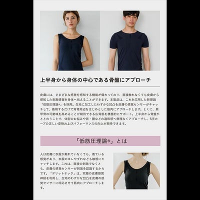 本製品は、新理論「低筋圧理論」を採用し、生地の凹凸を皮膚の 感覚センサーがキャッチして、着用するだけで背骨周りをはじめとした 筋肉にアプローチします。
