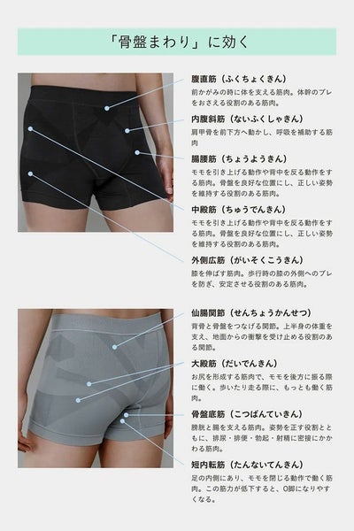 股関節、骨盤まわりの筋肉の本来の動きを促すため、一般的なスパッツやパンツを履いた時に比べ、骨盤周辺の筋活動量が約1.7倍に。