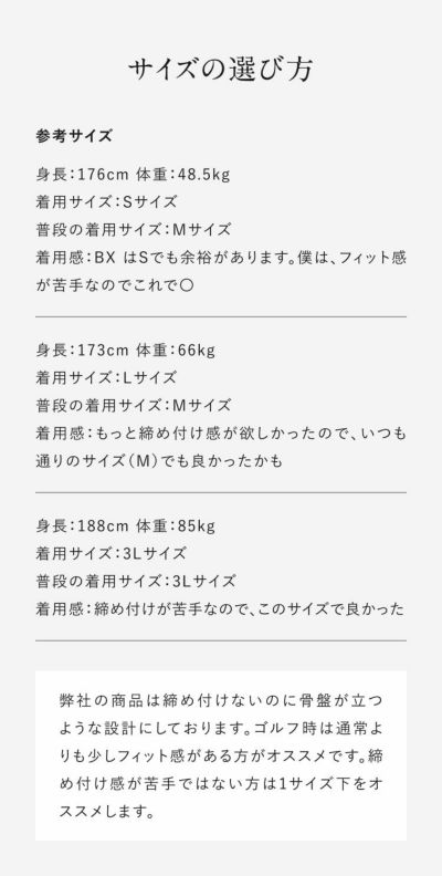 本商品は、締め付けないのに骨盤が経つ設計にしております。 ゴルフは通常よりも少しフィット感がある方がオススメです。 締め付け感が苦手ではない方は、1サイズ下をオススメします。