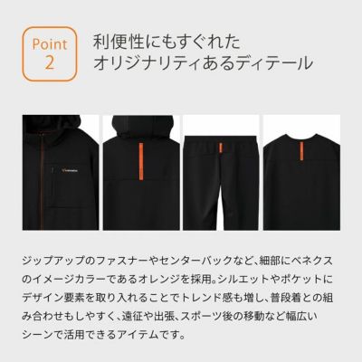 後ろヨークのセンターにはベネクスのシンボルマーク入りのオレンジテープを施し機能性、着心地の良さを追求しながらクールなデザインに仕上げたハーフパンツです。