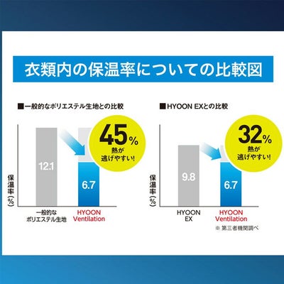 ●【放熱性】一般的なインナーに比べて細い40デニールのナイロン糸を採用。ウェア内の熱を効率的に逃がす放熱性にも優れているため、着用中も涼感が持続します。 一般的なポリエステル生地よりも『45%熱が逃げやすい』構造です。
