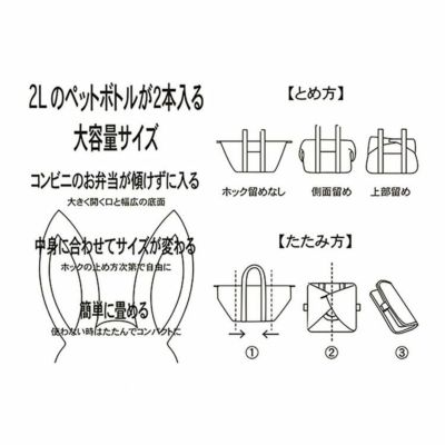 中身やサイズに合わせてホックの止め方を調節でき、600mlペットボトルはもちろん2Lペットボトルを横に2本収納できます。