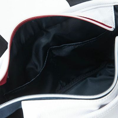 柔らかく高級感のある本革調のエンボス合皮を使用したラウンドバッグ。ブランドカラーのトリコロールロゴがアクセントとして配置され、ジッパープルにはトミーフラッグが使用されています。