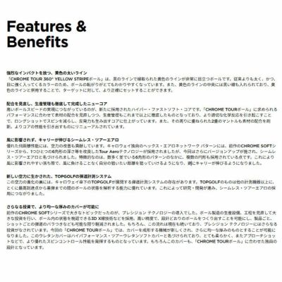 飛距離などの性能は、通常のCHROME TOURボールと同じで、専用設計のハイパー・ファストソフト・コアは、素材の配合を新しくしたことなどで、優れた反発力を発揮するものとなっており、ボールスピードが大きく向上。