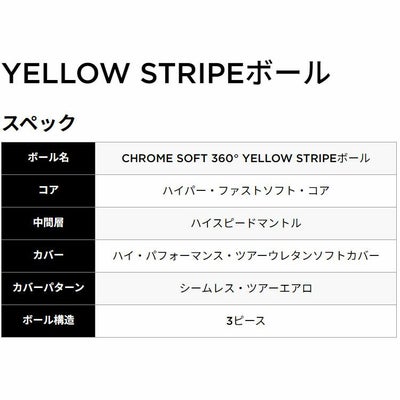 「CHROME SOFT 360° YELLOW STRIPEボール」の性能は、言うまでもなくCHROME SOFTボールと同じです。非常に柔らかい打感ながら、大きく飛び、かつ、グリーン周りにおいてはスピンもしっかり入るということで、日本でもアメリカでも長きにわたり人気となっているボールです。直近のリニューアルは2024年に行われ、あらゆる部分がアップグレードされました。とくに目覚ましいのは飛距離性能と打ち出し角の向上で、より幅広いレベルのプレーヤーに対応するツアークオリティのボールに仕上がっています。