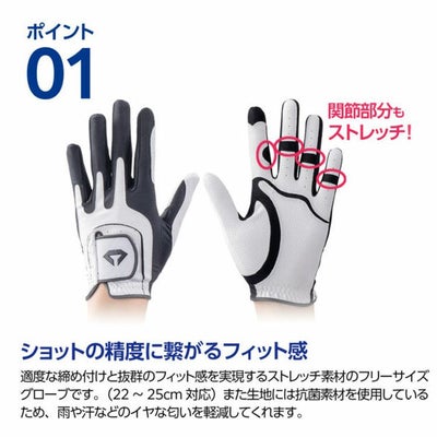 伸縮性に優れた抗菌ストレッチ素材と東レコーテックス社の合成皮革「トライト3000N」との組み合わせによって、様々な手の形状にフィットするフリーサイズのゴルフグローブです。