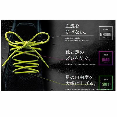 マジックレースは紐の伸縮率を部位に合わせて変えることにより、これらの問題を軽減し、足の本来の力を引き出します。