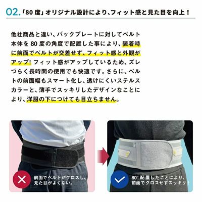 他社商品と違い、バックプレートに対してベルト本体を80度の角度で配置した事により、装着時に前面でベルトが交差せず、 フィット感と外観がアップ!フィット感がアップしているため、ずれづらく長時間の使用でも快適です。