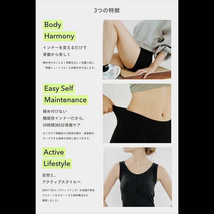 DERIT TECH(デリットテック)は骨盤を正しい位置へサポートする特殊設計のパンツや、足元から姿勢を整える靴下を展開。