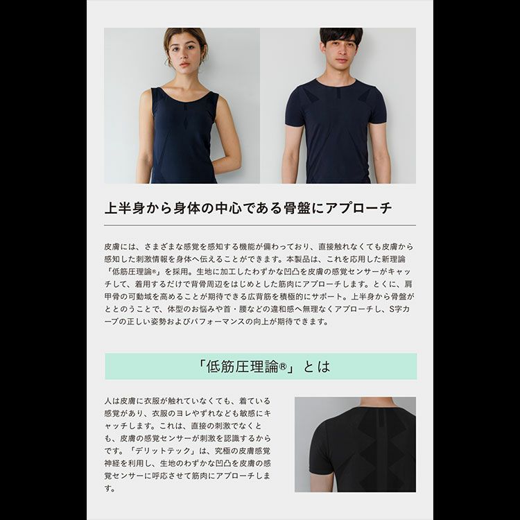 本製品は、新理論「低筋圧理論」を採用し、生地の凹凸を皮膚の 感覚センサーがキャッチして、着用するだけで背骨周りをはじめとした 筋肉にアプローチします。