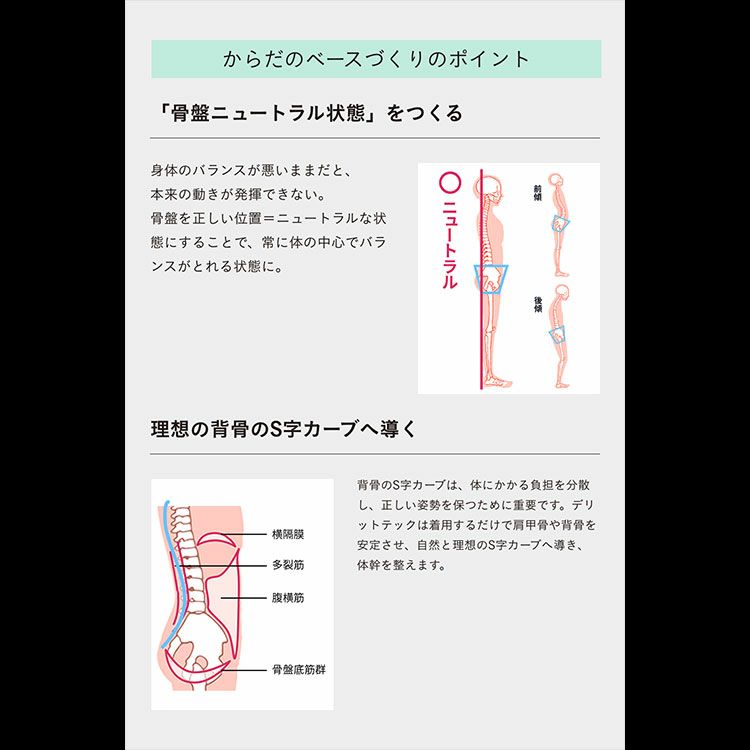 なかでも、肩甲骨の可動域を高めることが 期待できる広背筋もサポートします。上半身から骨盤がととのうことで、 体型のお悩みや首・腰などの違和感へのアプローチにより、S字 カーブの正しい姿勢およびパフォーマンスの向上が期待できます。