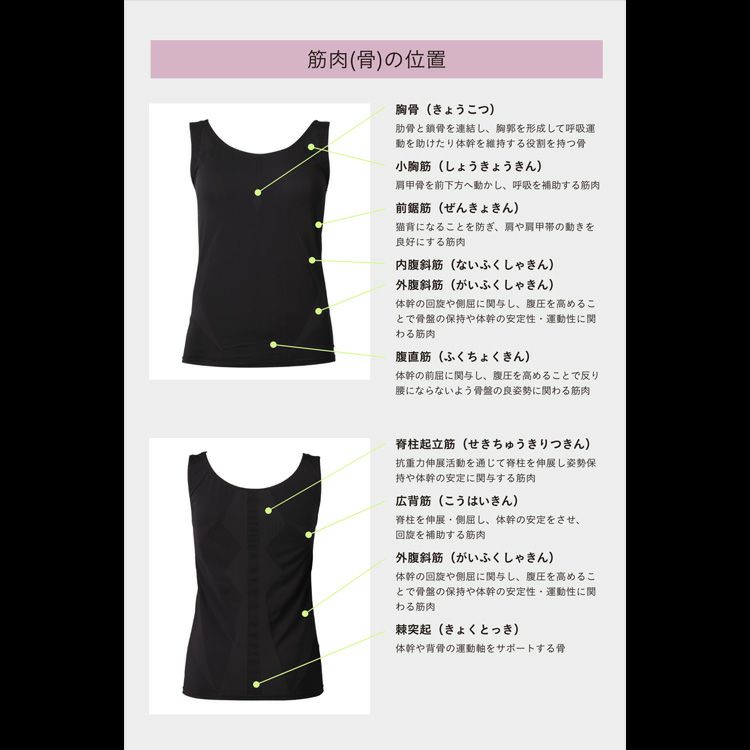 なかでも、肩甲骨の可動域を高めることが 期待できる広背筋もサポートします。上半身から骨盤がととのうことで、 体型のお悩みや首・腰などの違和感へのアプローチにより、S字 カーブの正しい姿勢およびパフォーマンスの向上が期待できます。