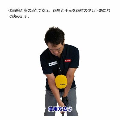 左右の腕と胸で、ボールを挟んでスウィングすることで、腕を上体と連動させて腰を回転させ、正しい体の動きを身につけます。