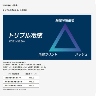 「接触冷感生地」「冷感プリント」「メッシュ構造」の3つの冷却技術を融合し、全身を包むクーリング効果を実現!