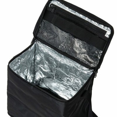 600mlペットボトルを6本立てて収納可能であり、天面にはメッシュファスナーポケットが装備されています。