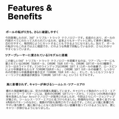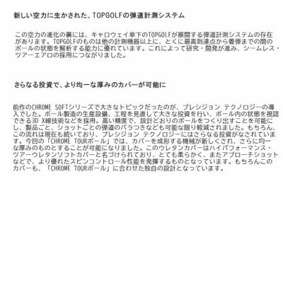 キャロウェイのアライメントで定番となっているトリプル・トラック テクノロジーの進化系、円周すべてへと延長した360°トリプル・トラック テクノロジーが導入されました。従来、ボールにおいては、赤い1本と青い2本のラインが一部にだけ短く入れられていましたが、360°トリプル・トラック テクノロジーのおかげで、これまでよりもターゲットに対して合わせやすくなり、置く角度によって変わっていた3本線の見え方やセットアップも常に一定にできるようになりました。搭載されるのは、風に負けることなく自分の狙いたい距離を狙っていきたいと考えているツアープレーヤーから高い信頼を得ているCHROME TOURボール、CHROME TOUR Xボール、CHROME SOFTボールの3モデルです。