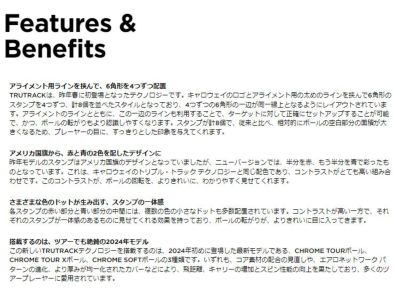 前モデルではアメリカ国旗のデザインでしたが、今回はハイコントラストなレッドとブルーを配色。また、中間部分にさまざまなカラーのドットも入れたことで、ボールの回転がさらにはっきり、きれいに見えるようになりました。搭載されるのは、ツアープレーヤーからも絶賛されているCHROME TOURボール、CHROME TOUR Xボール、CHROME SOFTボールの3種類です。
