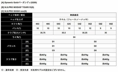 ※シャフトスペック値は、メーカー(Dynamic Goldバーガンディ=トゥルーテンパースポーツインクジャパン / N.S.PRO MODUS3 TOUR115 / N.S.PRO 950GH neo =日本シャフト株式会社 )の公表値になります。