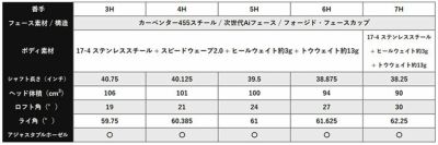 ボディ素材17-4 ステンレススチール + スピードウェーブ2.0 + ヒールウェイト約3g + トウウェイト約13g17-4 ステンレススチール+ ヒールウェイト約3g+ トウウェイト約13g