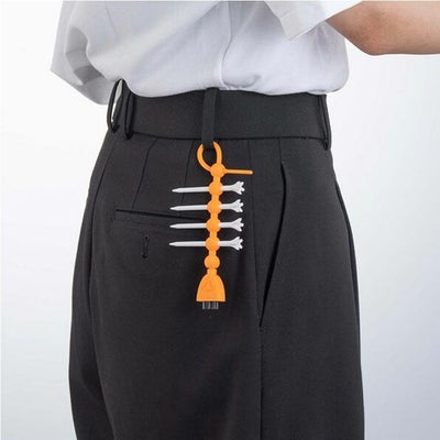ティーを4本収納でき、ブラシでクラブやボールの汚れを落とせる2WAY仕様のホルダー。シリコン製で抜き差ししやすく、回転ブラシは着脱可能。ベルトやバッグに取り付けて持ち運べる便利アイテムです。