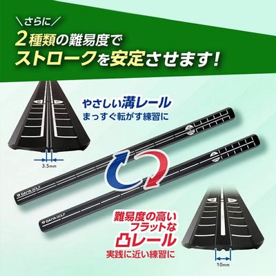 お手持ちのパターマットや自宅の平坦で水平な場所に置いて使用する、難易度の異なる両面で練習できるレール型のパター練習器具です。