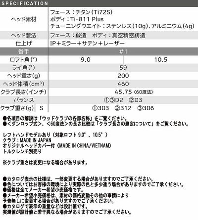 ヘッド素材フェース:チタン(Ti72S) / ボディ:Ti-811 Plus / チューニングウェイト:ステンレス(10g)、アルミニウム(4g)