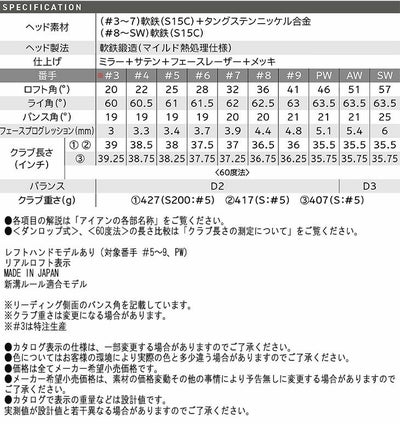 ヘッド素材(#3~7)軟鉄(S15C)+タングステンニッケル合金 (#8~SW)軟鉄(S15C)