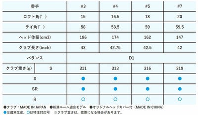 ●は通常生産、〇は特注対応可 ※クラブ重さは、変更になる場合があります。