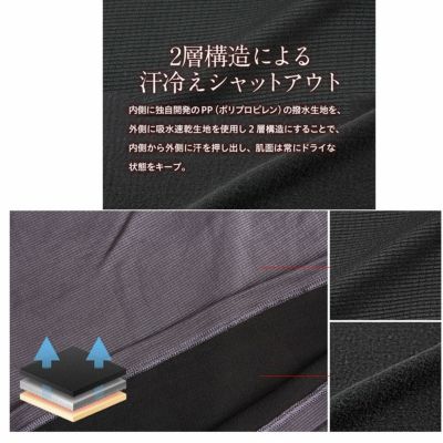 起毛させた撥水生地と吸水速乾生地の2層構造で汗冷えをシャットアウト。