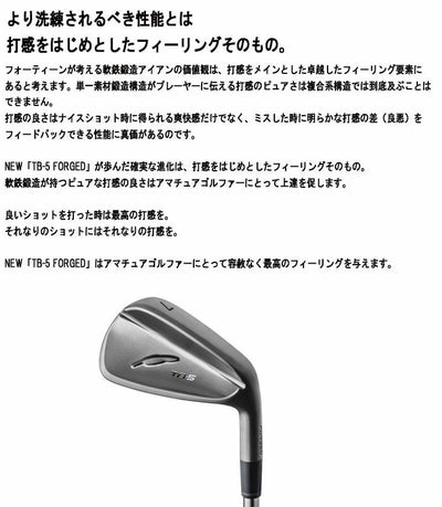フォーティーンが考える軟鉄鍛造アイアンの価値観は、打感をメインとした卓越したフィーリング要素にあると考えます。単一素材鍛造構造がプレーヤーに伝える打感のピュアさは複合系構造では到底及ぶことはできません。 打感の良さはナイスショット時に得られる爽快感だけでなく、ミスした時に明らかな打感の差(良悪)をフィードバックできる性能に真価があるのです。 NEW「TB-5 FORGED」が歩んだ確実な進化は、打感をはじめとしたフィーリングそのもの。 軟鉄鍛造が持つピュアな打感の良さはアマチュアゴルファーにとって上達を促します。 良いショットを打った時は最高の打感を。 それなりのショットにはそれなりの打感を。
