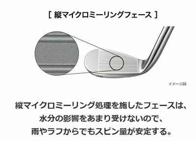 0 TOUR WEDGEは、フェース表面に縦目の微細なミーリングを加え、雨やラフからでも安定したスピン量が維持できるようにした。