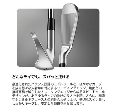 最適化されたバウンス設計のミドルソールと、緩やかなカーブを描き様々な入射角に対応するリーディングエッジ、地面との接地面積を減らしたトレーリングエッジから成るスピードソールデザインが、あらゆるライでの抜けの良さを実現。さらに、精密マシンミルドフェースとの組み合わせにより、適切なスピン量もしっかりキープし、安定した弾道を生み出します。