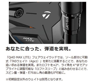 「Qi4D MAX LITE」フェアウェイウッドでは、ソール部分に可動式「TASウェイト(4gx1)」を新たに搭載することで、あなたの追い求める弾道を実現。またロフトを±2°、ライ角を4°までアップライトに調整可能な「ロフトスリーブ」と組み合わせることで、スピン量・弾道・打ち出し角の最適化が可能に。