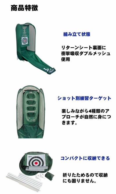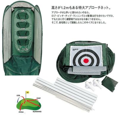 アプローチの繰り返し練習が気軽にできる練習器。折りたたんでコンパクトに収納できます。4種類の打ち出しの高さが確認できる、「ショット別練習ターゲット」付属。
