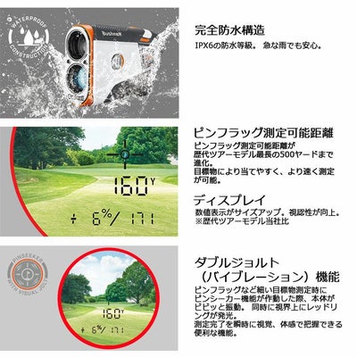 ピンフラッグ測定可能距離500ヤード、数値表示、対物レンズ径が拡張、明るく、ストレスのないクリアな視界を実現。