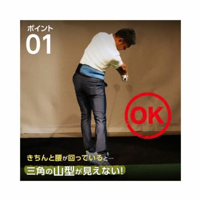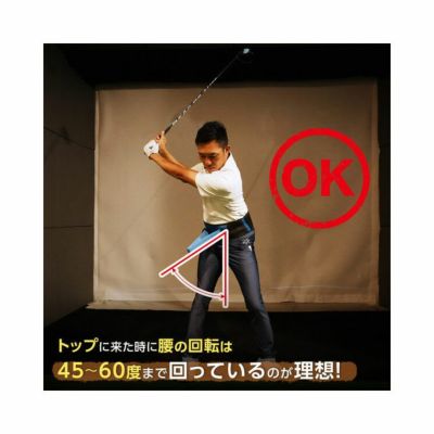 ベルトについた三角の山が、スイングの時の自分の腰に合わせて動くので視覚的に腰の捻転を確認することができます。テークバック時の腰の角度の目安は45度から60度になります。腰についた山の向きで腰がテークバックの時にどのくらい回っているのかが自分で確認できます。