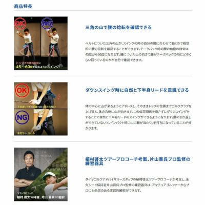 ダイヤゴルフアドバイザリースタッフである植村啓太ツアープロコーチ考案、永久シード保持の片山晋呉プロが監修の『ダイヤPRO スイングベルト』を発売します。『ダイヤPRO スイングベルト』の山が腰の中心位置になるように巻いた状態でスイング練習をすると、視覚的に自分の腰の捻転を確認できます。トップの位置までゴルフクラブを上げた時に体の右側に山が向くので、その位置関係を崩さずにダウンスイングをすると、下半身から上半身、腕という順番で体が動いて下半身リードのスイングができるようになります。これを繰り返し行うことで飛距離アップに重要な腰の動きを身につけられます。