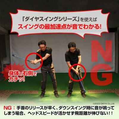 『ダイヤスイングSS』は、ヘッドスピードが約20~25m/sに達した時に「カチッ!」という音が鳴ります。この音が、インパクトゾーンから自分の体の左側※3で鳴るように意識してスイング練習をすることで、実際のゴルフクラブで打つ時に、自分の最大ヘッドスピードをインパクトで活かすことができるようになり、飛距離アップへ繋がります。