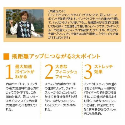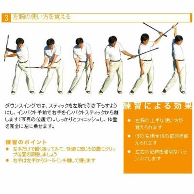 スティックに内蔵されたウェイトの上下動による、振動や音で理想的なスイングが習得できます。