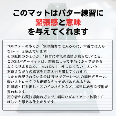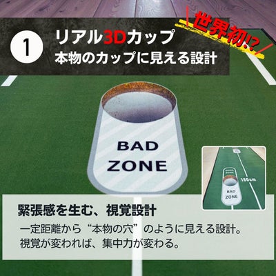 ■【錯視技術による3Dカップ設計】トリックアート技術を応用し、本物のカップがあるように見える設計。自宅でも本番さながらの緊張感でパッティング練習ができます。
