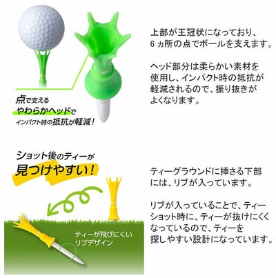 上部が王冠状になっており、6 ヵ所の点でボールを支えます。ヘッド部分は柔らかい素材を使用し、インパクト時の抵抗が軽減されるので、振り抜きがよくなります。