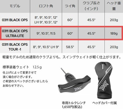 PXG 0311 ブラックオプス ウルトラライト ドライバーの仕様