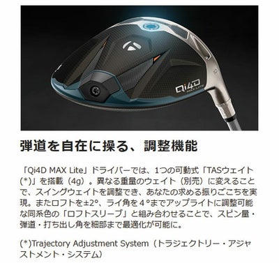 「Qi4D MAX Lite」ドライバーでは、1つの可動式「TASウェイト(*)」を搭載(4g)。異なる重量のウェイト(別売)に変えることで、スイングウェイトを調整でき、あなたの求める振りごこちを実現。またロフトを±2°、ライ角を4°までアップライトに調整可能な同系色の「ロフトスリーブ」と組み合わせることで、スピン量・弾道・打ち出し角を細部まで最適化が可能に。
