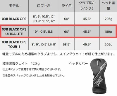 PXG 0311 ブラックオプス ウルトラライト ドライバーの仕様