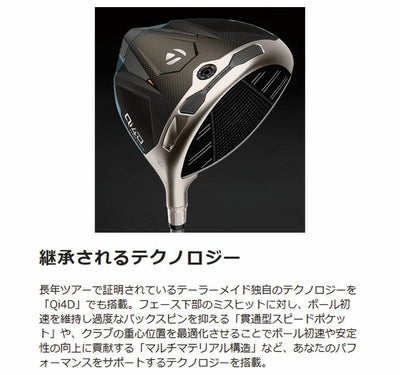 長年ツアーで証明されているテーラーメイド独自のテクノロジーを「Qi4D」でも搭載。フェース下部のミスヒットに対し、ボール初速を維持し過度なバックスピンを抑える「貫通型スピードポケット」や、クラブの重心位置を最適化させることでボール初速や安定性の向上に貢献する「マルチマテリアル構造」など、あなたのパフォーマンスをサポートするテクノロジーを搭載。